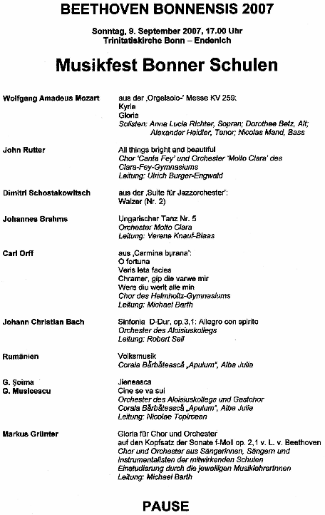 Ausführende : Chöre und Orchester aus Bonner Schulen (Aloisiuskolleg mit rumänischem Gastchor aus Alba Julia, Clara-Fey-Gymnasium,
